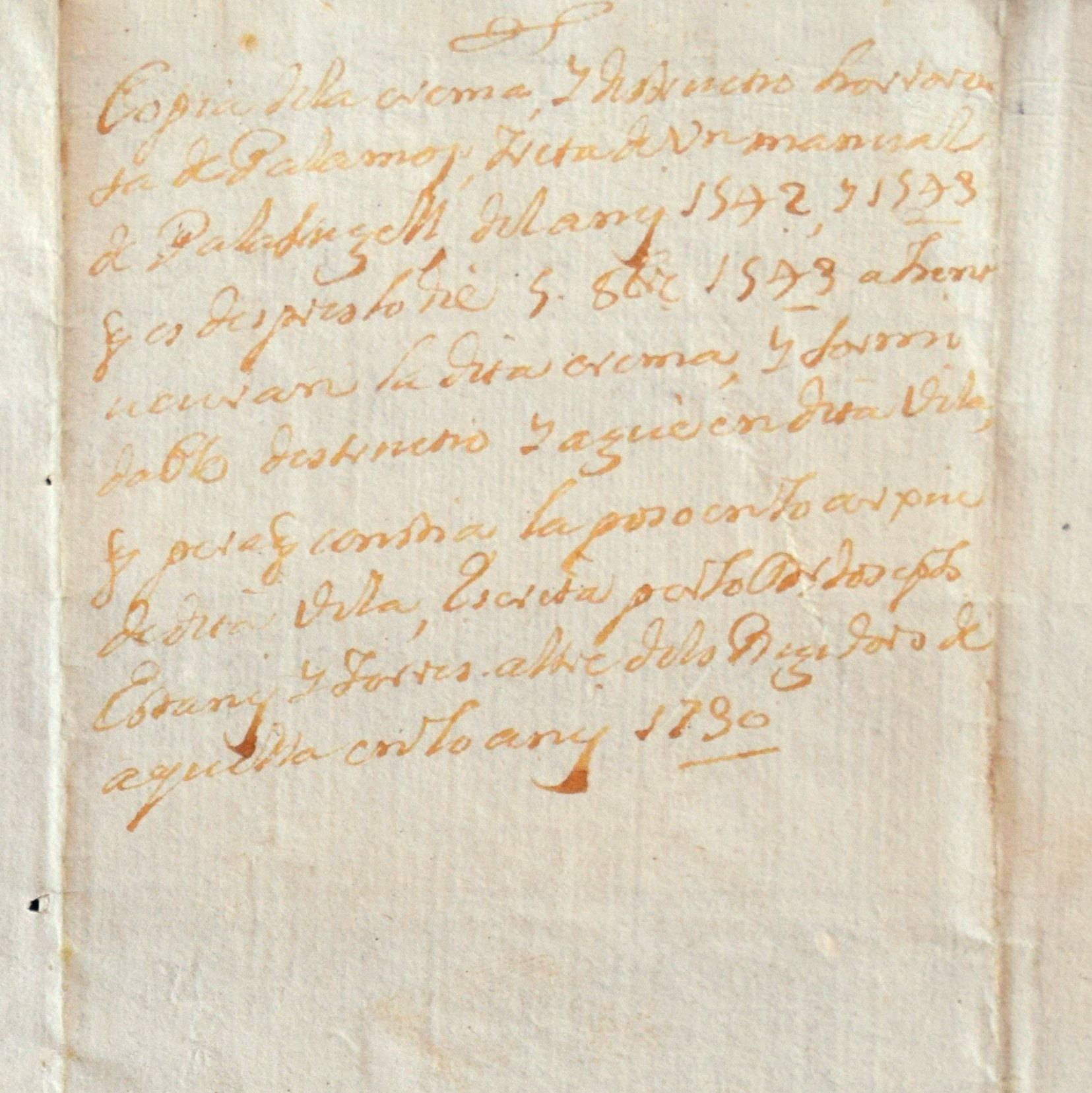 Còpia de la crema y destructió horrorosa de Palamós treta de un manual de Palafrugell de l’any 1542 y 1543, que és després lo die 5 octubre 1543; a hont veuran la dita crema y formidable destructió y agué en dita vila. Que, per a què cònstia, la poso en lo arxiu de dita vila, escrita per lo doctor Joseph Estany y Torres, altre dels regidors de aquella, en lo any 1730.